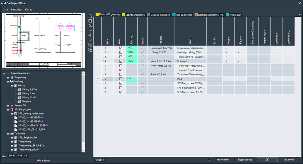 Wichtig! Für die Erstellung von Stromlaufplänen ist das Add-On Project Wizard erforderlich. Über den Konfigurator wird gesteuert, welche Makros zur Generierung der Pläne herangezogen werden. Die gesamte Projektdokumentation kann automatisch in allen im Lexikon gepflegten Sprachen übersetzt und als PDF ausgegeben werden.