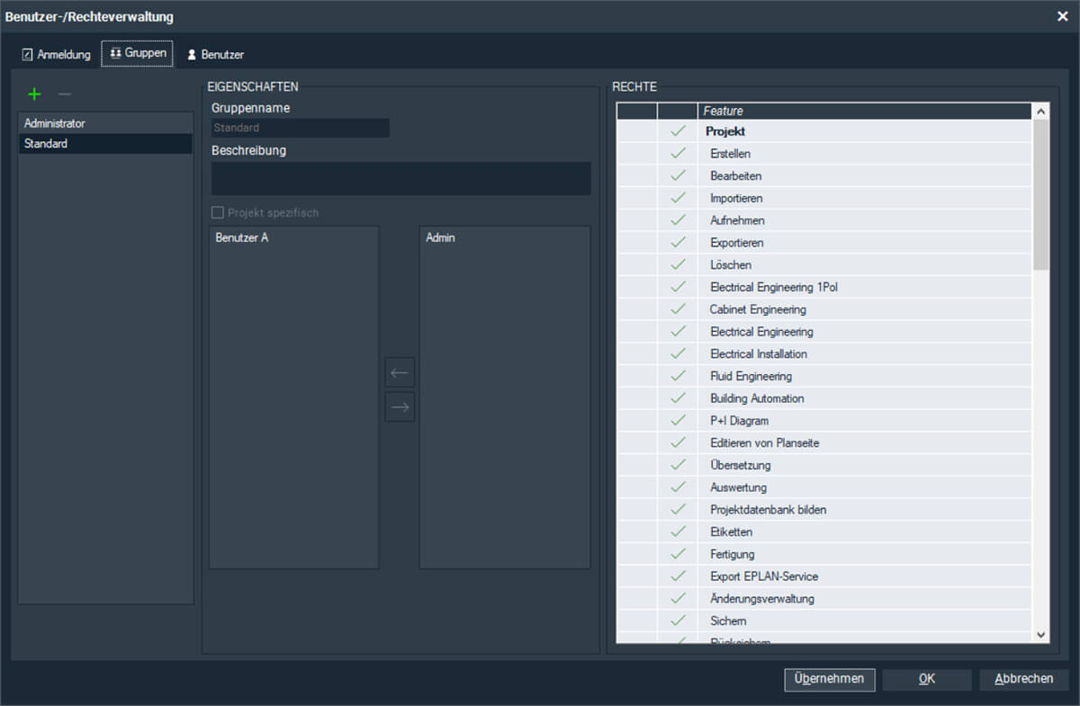 So kann in Arbeitsgruppen auch geregelt werden, wer Stammdaten pflegen darf und für Symbole und Makros verantwortlich ist. Das Add-On User Rights ist Voraussetzung für das Add-On PLM/ERPsync.