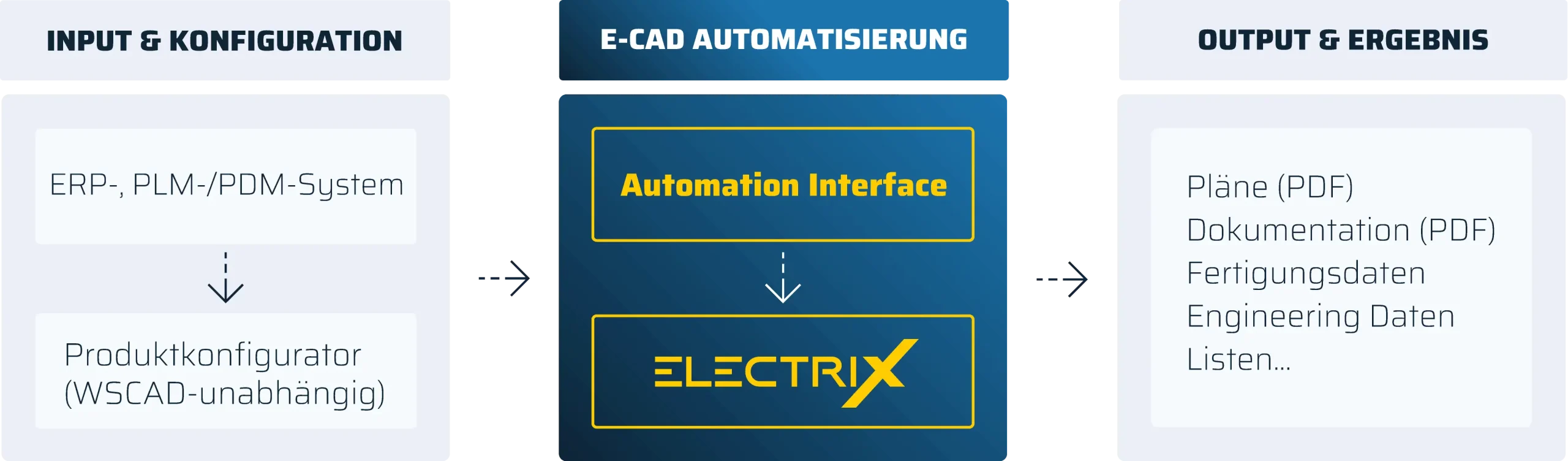 Das WSCAD Automation Interface (AI) ist eine Schnittstelle zwischen einem frei wählbaren, externen Produkt-Konfigurator und der WSCAD Software. Der Produktkonfigurator kann über das AI die WSCAD Software zur kompletten Erstellung aller E-CAD-Pläne und Dokumentationen veranlassen. Der gesamte Vorgang läuft als Hintergrundprozess im „Silent Mode“ ab, ohne Interaktion des Anwenders. Die WSCAD Software muss nicht vom Anwender gestartet werden.