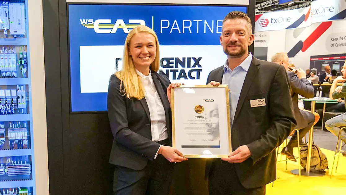 PHOENIX CONTACT ist seit 2023 WSCAD Premium Partner! Auf der SPS 2025 in Nürnberg wurde PHOENIX CONTACT erneut für die herausragende Zusammenarbeit ausgezeichnet, die stets von Engagement, Professionalität und Vertrauen geprägt war.