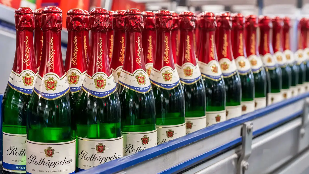 Production runs around the clock at Rotkäppchen Sektkellerei in Freyburg. Two lines fill up to 600,000 bottles daily – every minute of downtime counts.